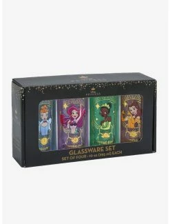 Cinderella, Ariel, Tiana, and Belle gather together to bring a touch of Disney royalty to your kitchenware as this glass set! Featuring colored designs of the Disney Princesses in mystic-style portrait graphics, this 4-piece set brings a regal touch to any toast.