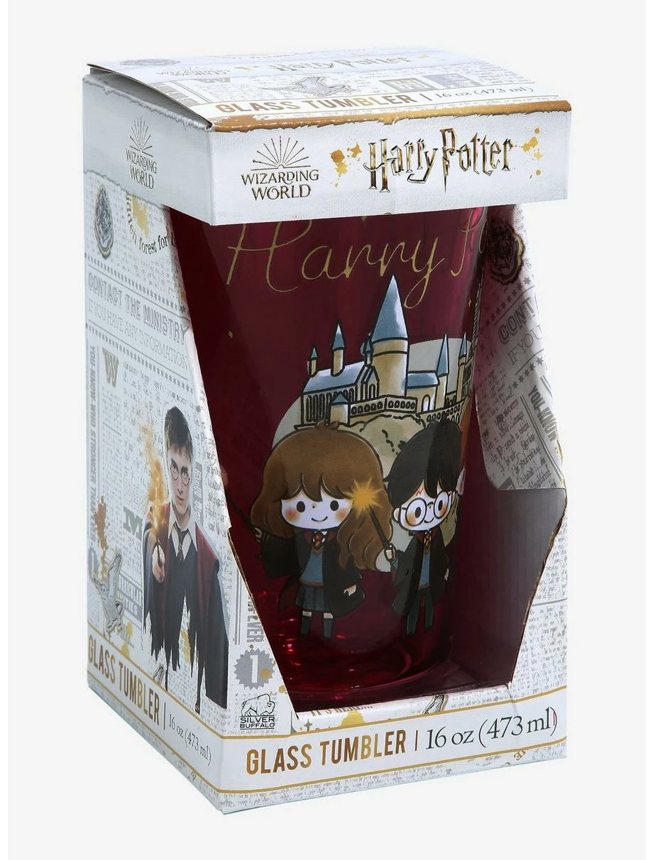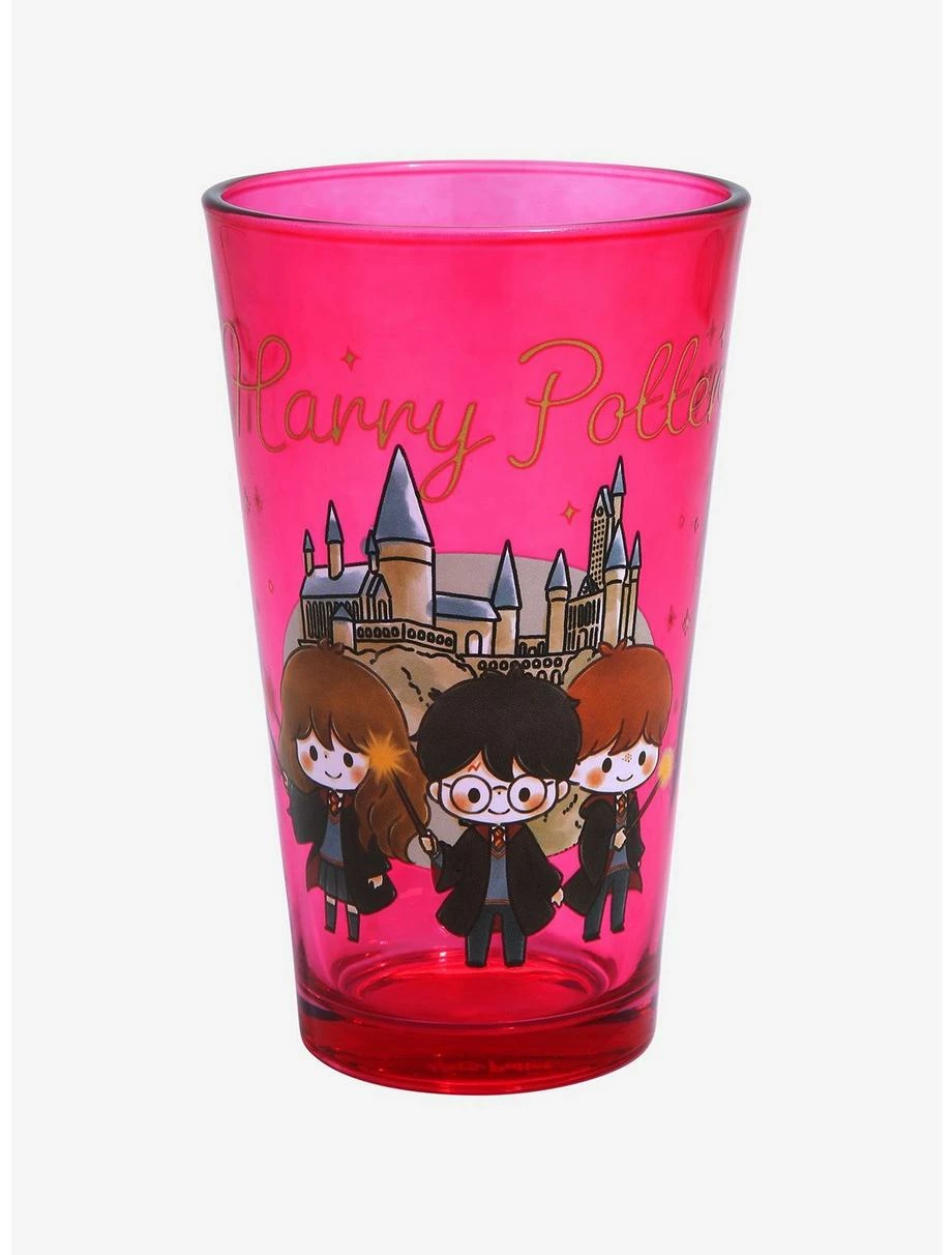 Ron, Harry, and Hermione get a chibi makeover on this pink Harry Potter pint glass! The trio pose in front of Hogwarts Castle to bring a magical touch to your happy hour.