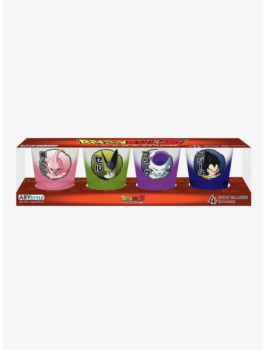 Officially licensed Dragon Ball Z glasses. Set includes (1) Heroes Shot Glass Set and (1) Villains Shot Glass Set. Each of the two themed set includes four glasses for a total of eight. Glasses hold approximately 1.5 oz. each. Glasses are dishwasher safe.