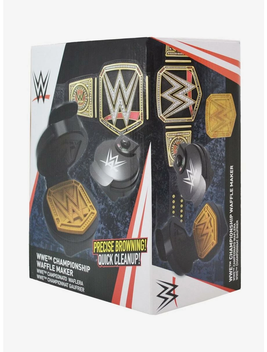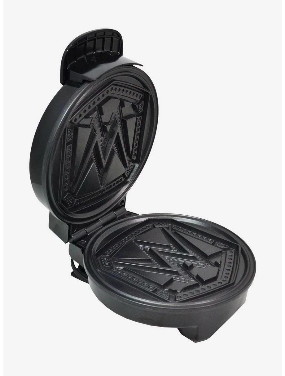 The WWE Championship Belt Waffle Maker is a mealtime winner! The shield-shaped waffle looks just like the coveted belt that has been won and proudly flaunted by superstars like John Cena, The Rock, and “Stone Cold” Steve Austin. And there?s no false finish here–indicator lights let you know when to pour batter and when it?s cooked just right. You can also whip up hash browns, cookies and other snacks on the non-stick plates, creating a perfect impression of the WWE belt every time. Features a regulating thermostat and weighted lid ensure perfect and even browning, five temperature settings let you make waffles tender and golden or brown and crispy with a turn of the dial, and dual indicator lights let you know when it’s time to pour the batter and when the waffles are ready. Measures 8.5″ x 5″ x 10″ and weighs 2.7 lbs.